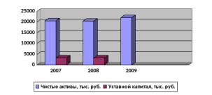 Рис. 1.3 – Динамика чистых активов и уставного капитала муниципального автономного учреждения г. Абакана «Спорткомплекс «Саяны» за 2007 – 2009 гг.