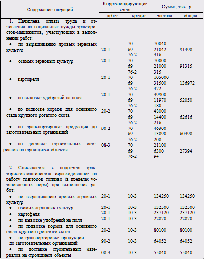 Однако расходы на оплату труда с отчислениями на социальные нужды трактористов-машинистов, а также стоимость нефтепродуктов, использованных тракторами и другими сельскохозяйственными машинами, на данном субсчете не учитывают. Указанные расходы включают в состав затрат на возделывание конкретных сельскохозяйственных культур и издержки незавершенного производства; на содержание отдельных видов и технологических групп скота прямым способом; на расходы по заготовлению (реализации) товарно-материальных ценностей.