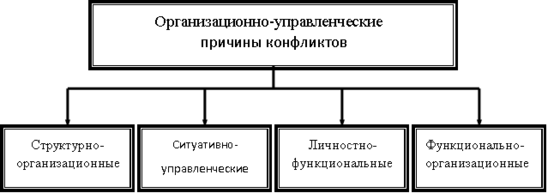 Вторая группа причин носит организационно-управленческий характер. Эти причины конфликтов связанны с созданием и функционированием организаций, коллективов и групп. Организационно-управленческие причины конфликтов делятся на: структурно-организационные, функционально-организационные, личностно-функциональные и ситуативно-управленческие. Все они показаны на рисунке 1.1.
