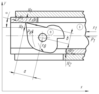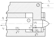 , направленными в противоположную сторону. Эти силы прижимают затвор к направляющим, что вызывает реакцию направляющих. Направляющие действуют на затвор с силами