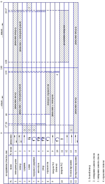 Запирание затвора осуществляется клином. При движении затворной рамы 1 вперед, она передним скосом воздействует на скос клина 2 и заставляет его подняться. Нижней частью клин попадает в паз затвора 3 – происходит запирание.