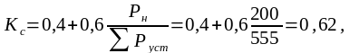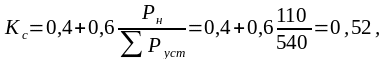Кс — коэффициент спроса, учитывающий степень загрузки и одновременности работы двигателей, а также КПД кабелей сети и двигателе
