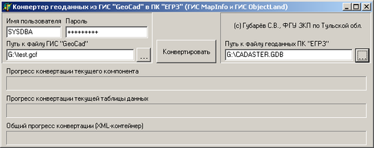 Тестирование программного продукта включало в себя проведение опытной конвертации тестовой базы из формата GeoCad в программный комплекс «ЕГРЗ» с последующим контролем целостности информации штатными средствами программного комплекса. Также случайным образом была проведена выборка данных из одной системы и ручная проверка переноса объектов в другую методом непосредственного сравнения. Все проверки показали успешный перенос данных из структуры, описанной в таблице 2 в структуру, описанную в таблице 3. Таким образом, разработанный программный модуль конвертации прошёл тестирование.