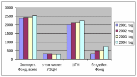 Проведенный анализ динамики фонда скважин за последние 4 года показывает (см. гистограмму), что эксплуатационный фонд скважин по НГДУ «ЛН»с 2001 года по 2004 год вырос с 2387 скважин до 2530. При этом происходит уменьшение ввода скважин, оборудованных УЭЦН. Это связано с тем, что по НГДУ ежегодно проводятся геолого-технические мероприятия, направленные на снижение обводненности добываемой продукции. К эти методам относятся закачка в пласты различных изоляционных материалов, таких как НБП, СНПХ9633 и др.