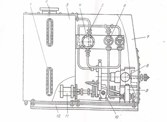 Рис. 5 Дозировочная установка УДС. 1 – указатель уровня, 2 – горловина, 3 – бак, 4 – манометр, 5 – предохранительный клапан, 6 – вентиль, 7 – кожух, 8 – насос дозировочный, 9 – обратный клапан, 10 –трехходовой клапан, 11 – фильтр, 2 – рама.