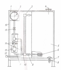 Рис. 4 Дозировочная установка УДЭ. 1- дозировочный блок, 2 – электроконтактный манометр, 3- указатель уровня, 4- заливная горловина, 5 – бак, 6 – фильтр, 7 – рама, 8 – сливной вентиль, 9, 10, 15 – вентили, 11 - всасывающий трубопровод, 12 – обратный клапан, 13 – электронасосный агрегат, 14 – нагнетательный трубопровод, 16 – кожух.
