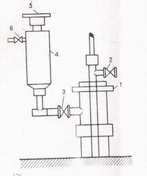 Периодическое дозирование может осуществляться при использовании перечисленного выше оборудования или с помощью специального устройства для ввода реагента под давлением, первый случай имеет те же недостатки что и непрерывное дозирование. Во втором случае затрубное пространство перекрывают задвижкой 3, открывают вентиль 6 для сброса газа из емкости 4, снимают заглушку 5, закрывают вентиль 6, заливают реагент в емкость 4, закрепляют заглушку и открывают задвижку 3; регент поступает в затрубное пространство.