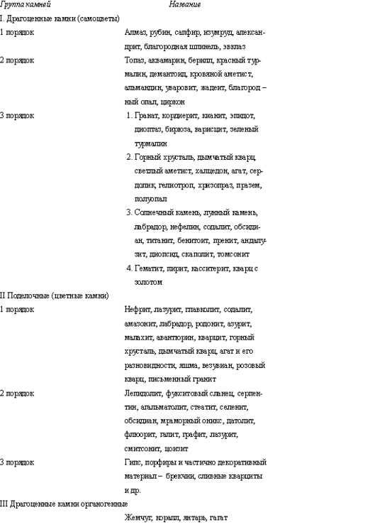 Приведенной классификацией длительное время пользовались в СССР и за рубежом [12]. Однако она не лишена ряда недостатков. Так, некоторые минералы одновременно отнесены к разным порядкам (горный хрусталь, агат, дымчатый кварц, лазурит и др.), в ряде случаев приведены групповые минералогические наименования одновременно с определенными, частными названиями (гранат и альмандин с уваровитом, берилл и аквамарин, халцедон и агат, сердолик, хризопраз и т.д.). К группе поделочных камней отнесен ряд минералов, которые в настоящее время имеют относительно высокую ценность, считаются полудрагоценными и широко применяются в ювелирном деле (авантюрин, малахит, амазонит, горный хрусталь, дымчатый кварц, розовый кварц, лазурит и др.). В настоящее время практическая ценность многих драгоценных камней существенно изменилась, в связи с чем классификация Бауэра-Ферсмана устарела [5].