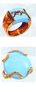 Этот камень когда-то называли "небесным камнем", получил свое название по одним источникам от персидского "пируз" - "одерживающий победу", а по другим, также от персидского, "фирюза" - "камень счастья". Бирюза в качестве украшения используется уже 10 тысячелетий. Особенно она почиталась у египтян, ацтеков, и народов Востока. Ювелирные изделия с бирюзой из гробниц египетских фараонов не знают равных. Египетская цивилизация непосредственно следовала за Месопотамской, и ювелирные украшения этой эпохи по праву считаются выдающимися. Персидские шахи в далеком прошлом даже устанавливали монополию на добычу бирюзы и все доходы от продажи поступали в казну шаха. Сокровищница шаха в подвалах ЦБ Ирана располагает уникальной коллекцией бирюзы. Особой ценностью обладает тиара шахини Фирах Пехлеви, где бирюза чередуется с бриллиантами [15]. Бирюза меняет оттенки от голубовато-белесового до сине-зеленого (Рис. 13). Наиболее ценной считается голубая бирюза. Минералы бирюзы, пересеченные бурыми и черными жилками, а также бирюза желто-зеленого цвета более низкого качества и потому значительно дешевле небесно-голубой.