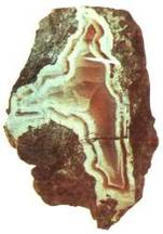 Полосчатые разновидности халцедона представлены агатами и ониксами. В агатах слои различной окраски расходятся концентрическими кругами причудливых волнистых очертаний, расположенных в основном параллельно друг другу. Камни с прямыми полосами и слоями называют ониксами или ленточными агатами (агатами уругвайского типа).