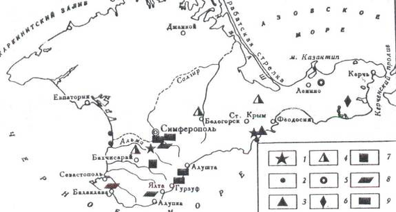 Рис. 20. Схема распространения самоцветных и поделочных камней на территории Крыма [6]: 1-халцедоновые самоцветы, 6 – гипс, 2-самоцветная галька, 7 – агат, 3 – трасс, 8 – мраморовидные известняки, 4 – кремень, 9 – диабазы, габбро, порфириты 5 – окаменелое дерево,