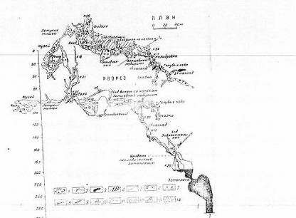 Рис. 10. План и разрез пещеры Большая Орешная (по материалам Красноярского спелеоклуба):