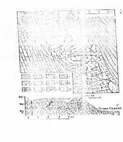 Рис. 7. Геологический план и разрез Рыжсковской площади (по данным Ивановской геологоразведочной экспедиции Красноярского геологического управления):