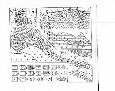 Рис. 11. Карстологическая схема и разрезы Павловского участка района Сисимского синклинория (Цыкин, 1990):