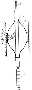 Скважинный резистивиметр многоэлектродного зонда (типа КСП) представляет собой трехэлектродный зонд небольшого размера, смонтированный в специальном кожухе (экранном устройстве), исключающем влияние стенки скважины на результаты замера ρр. Измерения проводят по обычной схеме замера КС.