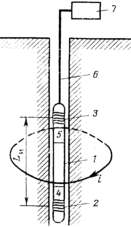 В самом элементарном виде индукционный каротажный зонд состоит из двух катушек - генераторной и измерительной, укрепленных на изолированном немагнитном стержне на некотором расстоянии Lи, друг от друга, называемом размером зонда . Генераторная катушка питается постоянным по величине переменным током высокой частоты (20-60 кГц), создающим переменное магнитное поле – прямое или первичное. В результате в породах; окружающих зонд индуктируются вихревые токи. токовые линии которых в однородной среде представляют собой окружности с центром по оси скважины. Вихревые токи создают. в свою очередь. вторичное переменное магнитное поле той же частоты.