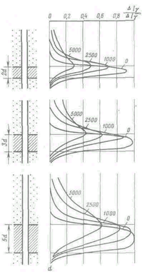При ντ>0 кривая становится асимметричной относительно середины пласта, растягиваясь в направлении движения прибора (снизу вверх). Амплитуда кривой против пласта начинает снижаться при большей мощности пласта. С увеличением параметра ντ отмеченные искажения кривой выражаются все более резко. Границы пласта отбиваются по началу крутого подъема и началу крутого спада кривой.