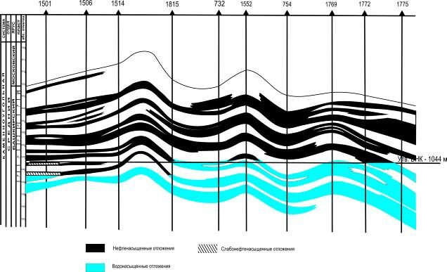 Уровень ВНК башкирской залежи залегает на абс. отм -1046 м, -1044 м (Воткинское поднятие), -1046 м и -1064 м (Черепановское поднятие).