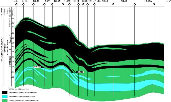 Отложения черепетского горизонта представлены переслаиванием известняков большей частью глинистых, аргиллитов с подчиненными прослоями мергелей, доломитов. Глинисто-карбонатные отложения черепетского горизонта в целом являются непроницаемой покрышкой для залежи нефти малевско-упинского горизонта. Нефтенасыщен в черепетских отложениях пласт Т-3, пласты Т-1 и Т-2 сложены известняками заглинизированными. Основные запасы нефти в турнейском ярусе приурочены к пласту пористо-кавернозных известняков общей толщиной до 36 м, залегающему в кровле малевско-упинского горизонта. Пласт довольно хорошо выдержан по площади, средняя нефтенасыщенная толщина составляет 14,4 м. Покрышкой служат аргиллиты подошвы черепетского горизонта. В большинстве скважин прослеживаются среди пористых плотные разности известняков толщиной от 0,8 м до 8,0 м, коэффициент расчлененности равен 3,98. Залежь имеет массивное строение. В подошвенной части залегает прослой плотных (по промыслово-геофизическим данным) низкопроницаемых пород толщиной 3-10 м, отделяющий его от пластов Т-5, Т-6.