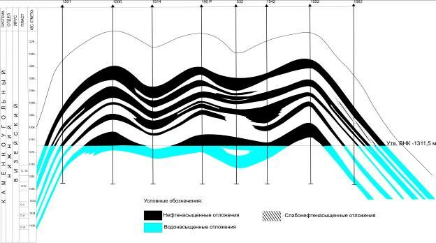 Нефтеносность доказана по пластам С-II, C-III, C-IV – тульский горизонт и С-V, С-VI, C-VII – бобриковский горизонт. Терригенные отложения визейского яруса представлены переслаиванием алевролитов, аргиллитов и песчаников. В верхней части яруса (тульский горизонт) преобладают глинистые разности, в нижней (бобриковский горизонт) – песчаники и алевролиты. Пласты коллекторы в пределах площади невыдержанны как по площади, так и по литологии. На небольших расстояниях песчаники замещаются алевролитами и глинистыми алевролитами. В среднем общая толщина терригенных отложений визейского яруса составляет 37 м, при изменении от 35 м до 43 м, средняя эффективная толщина 9,8 м, средневзвешенная эффективная нефтенасыщенная толщина - 4,8 м (рис. 7). Средневзвешенная по толщине пористость визейской залежи нефти составляет 20 %, нефтенасыщенность 71 %. Уровень ВНК на абс. отм. -1311,5 м , -1327,5 м.