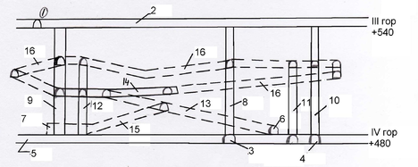 – IV горизонт (+480,0 м) – штреками 1–419 и 1–401, квершлагом 11К-400, откаточный орт №1, откаточный орт №2;