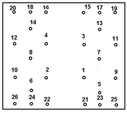 Рис. 6. Схема расположения шпуров в забое: 1–4-врубовые; 5–8, 13, 14 – отбойные; 9–12, 15–26-оконтуривающие