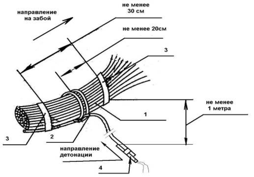 Рис. 7. Схема инициирования устройств от ДШ: 1 - Волноводы инициируемых устройств; 2 – ДШ-А; 3 - изолента или проволока; 4 - капсюль детонатор или электродетонатор
