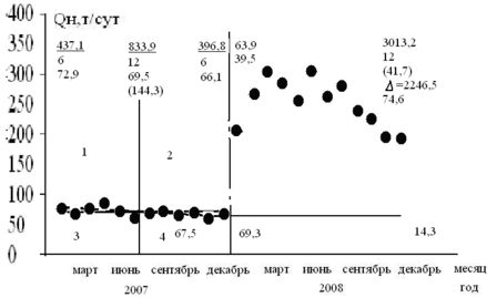 По количеству и положению точек после начала воздействия относительно горизонтальной базовой прямой наглядно выявляется качественный эффект (все 12 из 12 точек расположены выше базовой горизонтали) и его динамика. Для количественной оценки эффективности бурения горизонтальных скважин по эксплуатационным карточкам определяем суммарную добычу нефти после ввода скважин в эксплуатацию на дату анализа (с 1.01.2008 по 1.01.2009 гг.). Она оказалась равной 3013,2 т. Отсюда среднемесячная добыча нефти после воздействия оказалась равной 251,1 т, или на 290% больше базовой (63,9 т).