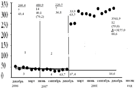 В координатах «месячная добыча нефти – календарное время» за нулевой отсчет времени принимаем месяц (11.2006) на 14 месяцев раньше месяца введения горизонтальных скважин из бурения (01.2008), т.е. в качестве ближней предыстории берем 14 месяцев. На график (рис. 8) наносим точки месячной добычи из указанной скважины по месяцам до и после ввода скважины в эксплуатацию. Проводим вертикальную прямую точку (01.2008), которая делит время на две части (до и после ввода скважины в эксплуатацию).