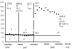 Далее определяем количественные показатели тренда. Для этого по эксплуатационным карточкам определяем добычу нефти за первые 7 месяцев (575,6 т) и вторые 7 месяцев (517,7 т) предыстории. Отсюда вычисляем среднемесячную добычу за первую половину (82,4 т) и вторую половину предыстории (74,0 т). Через последние две точки и центр квадратной диаграммы проводим наклонную прямую до пересечения границы предыстории и истории (01.2008 – дата ввода скважин в эксплуатацию). В этой точке пересечения определяем базовую среднемесячную добычу нефти (70,4 т) и из нее проводим горизонтальную прямую (параллельную оси времени) на весь период истории (последствия). Таким образом, считаем, что падение добычи нефти происходит только в период предыстории, а в период после воздействия базовая добыча нефти является постоянной, не падающей, что, естественно, занижает технологический эффект.