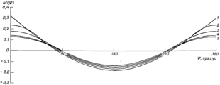 1 – сосредоточенная сила; угловая координата точек приложения сил , градус: 2 – 20, 3 – 30, 4 – 40, 5 – 60, 6 – 80;  – текущая координата