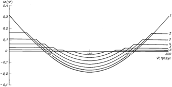 Рис. 13. Эпюра изгибающих моментов М() в поперечном сечении гибкой трубы, взаимодействующей с плашками при Rтр.н < Rп: