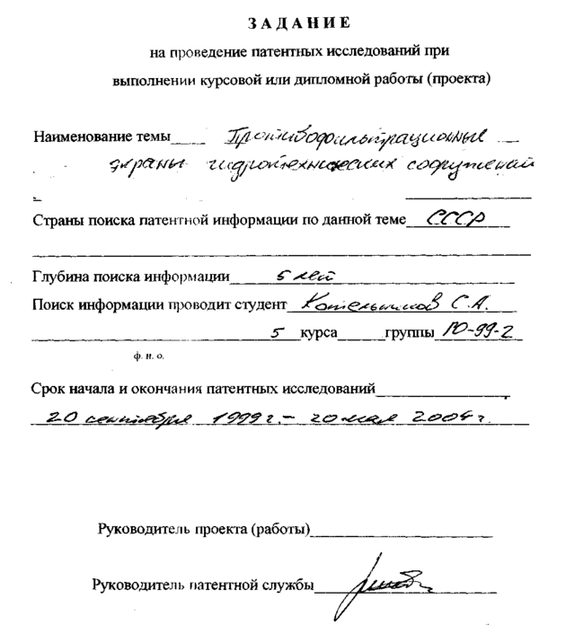 Примечание: В случае принятия решения об использовании в дипломной работе (проекта) выявленной разработки защищенной патентом, студент обязан сделать проверку в отношении СССР. Проверка производится путем просмотра "Указателя действующих патентов в СССР".
