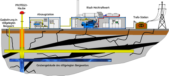 Описанная ниже установка применяется для активного отсасывания шахтного метана из угольных пластов действующих и закрытых шахт и последующей тепловой утилизации метана в камере сжигания или для энергетического применения в контейнерных электростанциях.