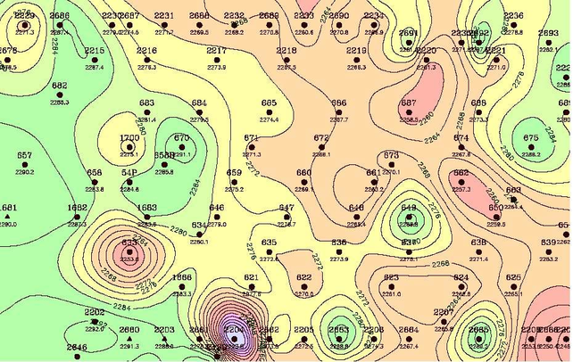 Из-за больших размеров, приведем только небольшую часть структурной карты продуктивного пласта БС10-1. На рис. 2.1 представлена структурная карта участка блока N 13 ( район скв. 684 – 688, 2231 – 2234), т.е. тот блок, где предполагается проведение работ по улучшению нефтеотдачи пласта. Структурная карта представляет собой изображение в горизонталях (изогипсах) рельефа и построена по кровле пласта БС10-1. Она дает четкое представление о строении выбранного горизонта, обеспечивает наиболее точное проектирование разведочных и эксплуатационных скважин, облегчает изучение изменения свойств по площади продуктивного горизонта (мощности, пористости, проницаемости), помогает определить границы залежи и распределение давлений. За базисную поверхность при построении этой