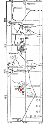 3 – д. Колюткино; 4 – Сысертское; 5 – Соколиный камень; 6 – Абрамовское; 7 – Черкаскульское; 8 – Иткульское; 9 – Тюбукское; 10 – Аллакское; 11 – Кисегачское; 12 – Каслинское; 13 – М-Каслинское; 14 – Голодное; 15 – Красное; 16 – Теченское; 17 – Увильды; 18 –Уфимское; 19 – Таганайское; 20 - Уреньгинское; 21 – Михайловское; 22 – Светлинское; 23 – Борисовское; 24 – Каменское; 25 Карталинское