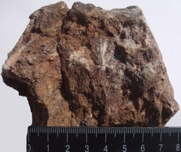Мусковит-кианитовый сланец (шлиф № Б1) – порода бурого цвета за счет развития гематита по всей массе породы. Текстура породы сланцеватая. Структура породы порфиробластовая, обусловленная крупными кристаллами кианита радиально-лучистого строения размером до 0,7×2 см. Цвет кристаллов кианита в породе серый с синеватым оттенком. В породе видна трещиноватость, которая не имеет какой-либо ориентировки.