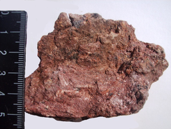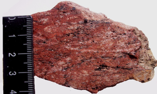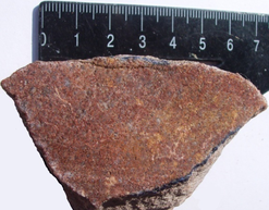 Мусковит-кианитовый сланец (шлифы № Б16-1, Б16-2)порода плотная красно-бурого цвета с магнетит-гематитовыми прослойками черного цвета. Мощность слойков невыдержанна и достигает 1,5 мм. Текстура породы сланцеватая благодаря ориентированным кристаллам кианита. Внешне структура породы среднезернистая (зерна в породе до 7 мм).