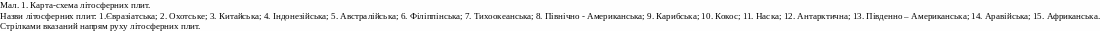 Сьогодні загальновизнаним є той факт, що континенти й океанічне дно ‑ це окремі плити, що переміщаються по поверхні мантії відносно одна одної (Мал.1.). Даний процес відомий за назвою тектоніка плит і описує структурні особливості земної кори. Термін "тектоніка" буквально означає "утворення" [2].