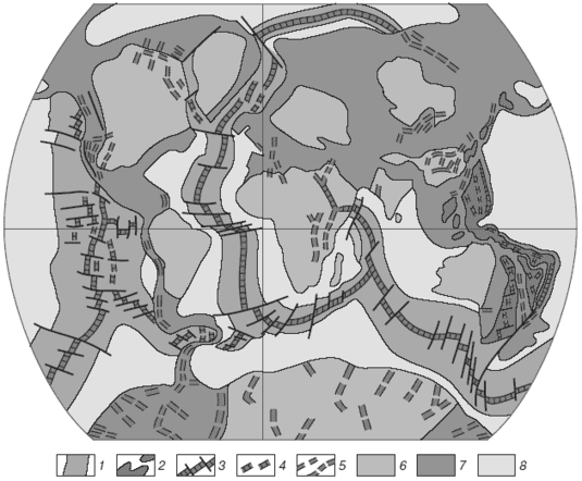 1 - внутріокеанічні спредингові пояса; 2 - Західно-Тихоокеанський кінцево-океанічний спрединговый пояс; 3 - активні осьові зони спредингових поясів і їх найбільші трансформні розломи; 4 - відмерлі осьові зони спредингових поясів; 5 - континентальні рифтові зони і системи; 6 - стабільні ядра континентів - древні платформи; 7 - рухливі пояси різного віку в межах континентів і їхніх окраїн; 8 - області дна океанів поза кайнозойських спредингових поясів переважно з мезозойською корою океанічного типу.