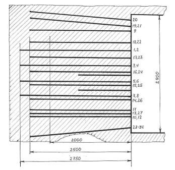 У почвы выработки расстояние между шпурами может быть несколько уменьшено, а у кровли, соответственно, несколько увеличено.