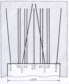 Расстояние между устьями врубовых шпуров, сходящихся на клин, определяются из условия расположения в забое бурового оборудования и инструмента (т.е. чтобы ширина выработки позволяла бы пробурить наклонные врубовые шпуры требуемой глубины).