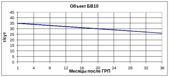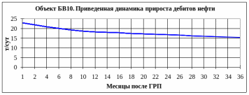 По объекту БВ10 в первый год после ГРП прирост дебита нефти находится в диапазоне 20-25 т/сут, через 2 года его величина снижается примерно на 20% (17-18 т/сут), а к концу анализируемого периода (3 года) уменьшается до 15-16 т/сут.