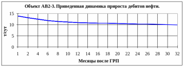 По объекту АВ2-3 разброс значений прироста дебита во времени относительно высок и, практически на протяжении всего периода колеблется на уровне 12 т/сут, снижаясь на последнем отрезке анализируемого периода (через 2.5 года) до 9-10 т/сут.