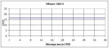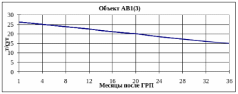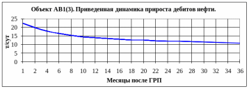 По объекту АВ13 в первые месяцы после ГРП прирост дебита нефти составляет около 20 т/сут, через год его величина снижается на 30% (14-15 т/сут), а к концу анализируемого периода (3 года) уменьшается в 2 раза (до 10 т/сут).