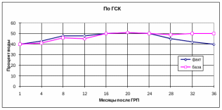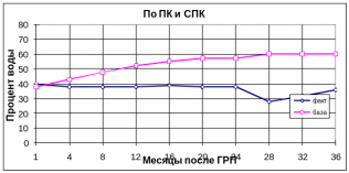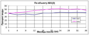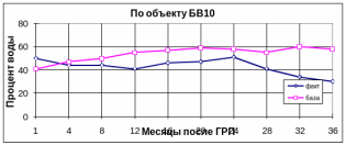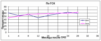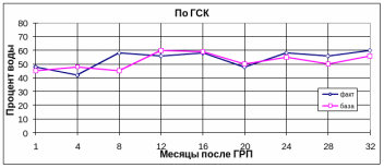Стоит оговориться, что ввиду малого количества скважин с ГСК по пласту БВ10 и разницей во времени проведения в них работ характер кривой имеет скачкообразный характер. Поэтому в данном случае объективно можно судить об изменении динамики обводненности в течение двух лет после производства работ, когда в расчет принято наибольшее количество скважин.