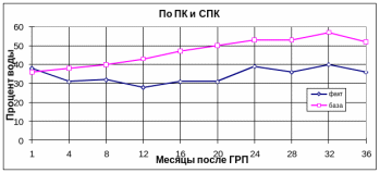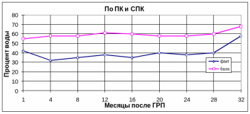 Зависимости, приведенными на рисунках 3.4-3.6 иллюстрируют, что положительное влияние ГРП на динамику обводнения происходит, главным образом во 2 типе разреза (ПК и СПК), где обводненность скважин вследствии ГРП снижается в среднем на 20-30%. Тогда как в разрезе 1 типа (присутствие ГСК) изменения обводненности практически не происходит.