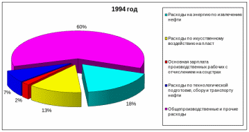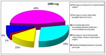 На рис. 4.2 отражено изменение соотношения основных составляющих условно-переменных затрат на добычу нефти в 1993-1995 гг. Заметно, что в 1995 году произошло существенное увеличение расходов на энергию по извлечению нефти, и расходов по искусственному воздействию на пласт, связанных в первую очередь с увеличением тарифов на электроэнергию и с увеличением объемов работ по повышению пластового давления, что во многом обусловлено проведением ГРП. Например, расходы на энергию по извлечению нефти увеличилась с 1994-го по 1995 год в 4.3 раза, расходы по технологической подготовке, сбору и транспорту нефти - в 3.3 раза, основная зарплата производственных рабочих - в 2 раза, общепроизводственные и прочие расходы - в 2.6 раза.