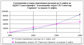 На рис. 4.1 (б) отражено соотношение условно-переменных расходов и возмещаемых затрат СП "Самотлор Сервисиз" не покрывали тех затрат, которые несло ОДАО"Самотлорнефть" за подъем той части дополнительно добываемой нефти, которая по договору распределялась в пользу СП.