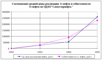 На рис. 4.1 (а) отражено соотношение средней цены реалиции одной тонны нефти и себестоимости 1т нефти по ОДАО"Самотлорнефть". График показывает, что уже в процессе реализации заложены убытки в 1992 - 1994 гг., т.к. этот период характеризуется превышением затрат на добычу нефти над уровнем цены реализации нефти. В 1995 г. нефть реализовалас по цене, превышающей затраты на ее добычу.